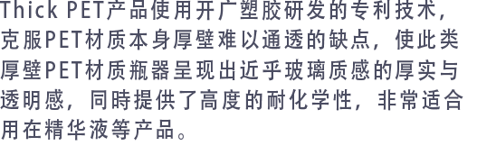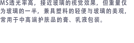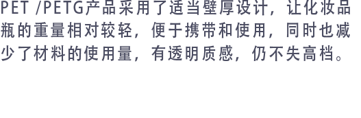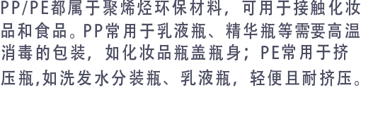 PP/PE都属于聚烯烃环保材料,可用于接触化妆品和食品。PP耐热性高于PE,因此 PP常用于乳液瓶、精华瓶等需要高温消毒的包装,如化妆品瓶盖瓶身;PE柔韧性优于 PP,常用于挤压瓶,如洗发水分装瓶、乳液瓶,轻便且耐挤压。